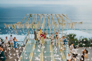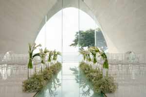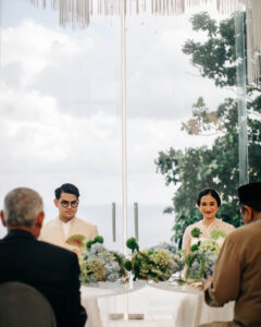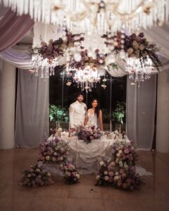 距離を越え、時間を越え、二人が出会った頃の夜空に煌めく花火のような、変わらぬ情熱と ロマンチックな眼差しで見つめ合うAlison & Deke。 そんなふたりの心を映すテーマは、夢見心地の おとぎ話、モーヴ、ライラック、ヴィイオレットまで、パープルのニュアンスにホワイト、ブラッシュ、グリーンのシャイドが‘その日’を芳しい色合いで包みます。Alisonは、マーメードのガウンでグラマラスに、 ボディとネックラインをレースが華やかに包み、ジェットブラックの豊かで艶やかな髪が、彼女を美しくも力強く、凛とした佇まいを引き立たせます。Dekeはエクルのピークドラペルがスタイリッシュなシングル ボタンのスーツに身を包みます。肩から袖にかけてあしらわれたゴールドのボタニカルなエンブロイダリー、シルバーのタイピンがなんともドラマチック、細い縁のメガネ、そしてDekeのお茶目な表情が決まりすぎない、上級者的洒落者感を醸し出しています。DekeがAlisonへ宛てたPoemがスクロールで お目見え、皆のため息と共に、会場は愛に溢れた夜でした。