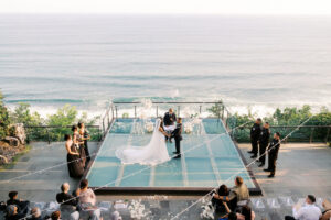 フィットネス、知らない世界を旅することを愛する二人が初めて出会った日から、7年の月日が経ちました。その間に二人は居を構え、新しい命を授かり、家族三人の愛しく、満ち足りた生活を大切に、ゆったりと築いてきた二人でした。Sophia & Adeの‘その日’は、二人のルーツであるインドネシア、オーストラリアの家族や友人達が紡ぐ豊かなレガシー、美しい文化のタペストリーが テーマとなりました。アイランドの鮮やかな花々、スカイブルーをバックに輝く樹々や緑、紺碧のインド洋をバックに、ミニマルなブラック&ホワイトが会場をたちまちシックでエレガントに包む魔法。今はもう会うことが叶わない家族への想いが溢れるセットアップも二人の丁寧な生き方、家族・友人との強い絆ゆえのことでしょう。スィートハートの胸元、レースのボダイズ、マーメードのスカートは鍛えられたSophiaのボディーをより艶やかに包み、ドラマティックなトレインとベールが大人の甘さのエッセンスで満たします。 Ade、ブライズメイド&グルームスメンのオールブラックな装い、カラリリーのシンプルなブーケ&ローズのブートニアがエレガント。二人、愛しのLeo、ゲストの皆が纏うバイブス、オーラが弾けて夜空を彩る ‘その日’でした。